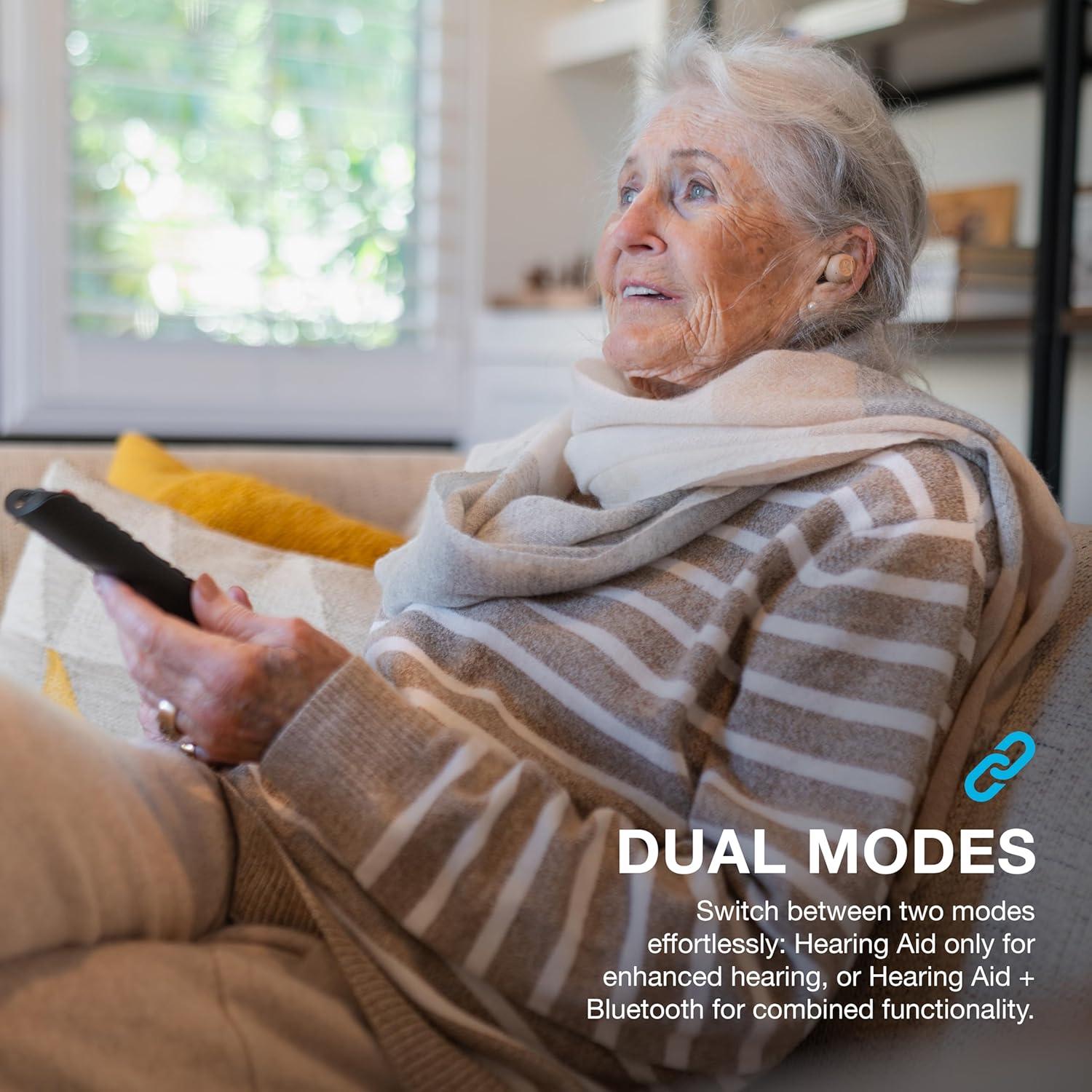 🤳🎶 DUAL MODES: Easily pair Hear OTC Hearing Aid & Earbuds with your phone for seamless Bluetooth connectivity, allowing you to enjoy music and take calls just like with regular earbuds. Switch between two modes effortlessly: Hearing Aid only for enhanced hearing, or Hearing Aid + Bluetooth for combined functionality.