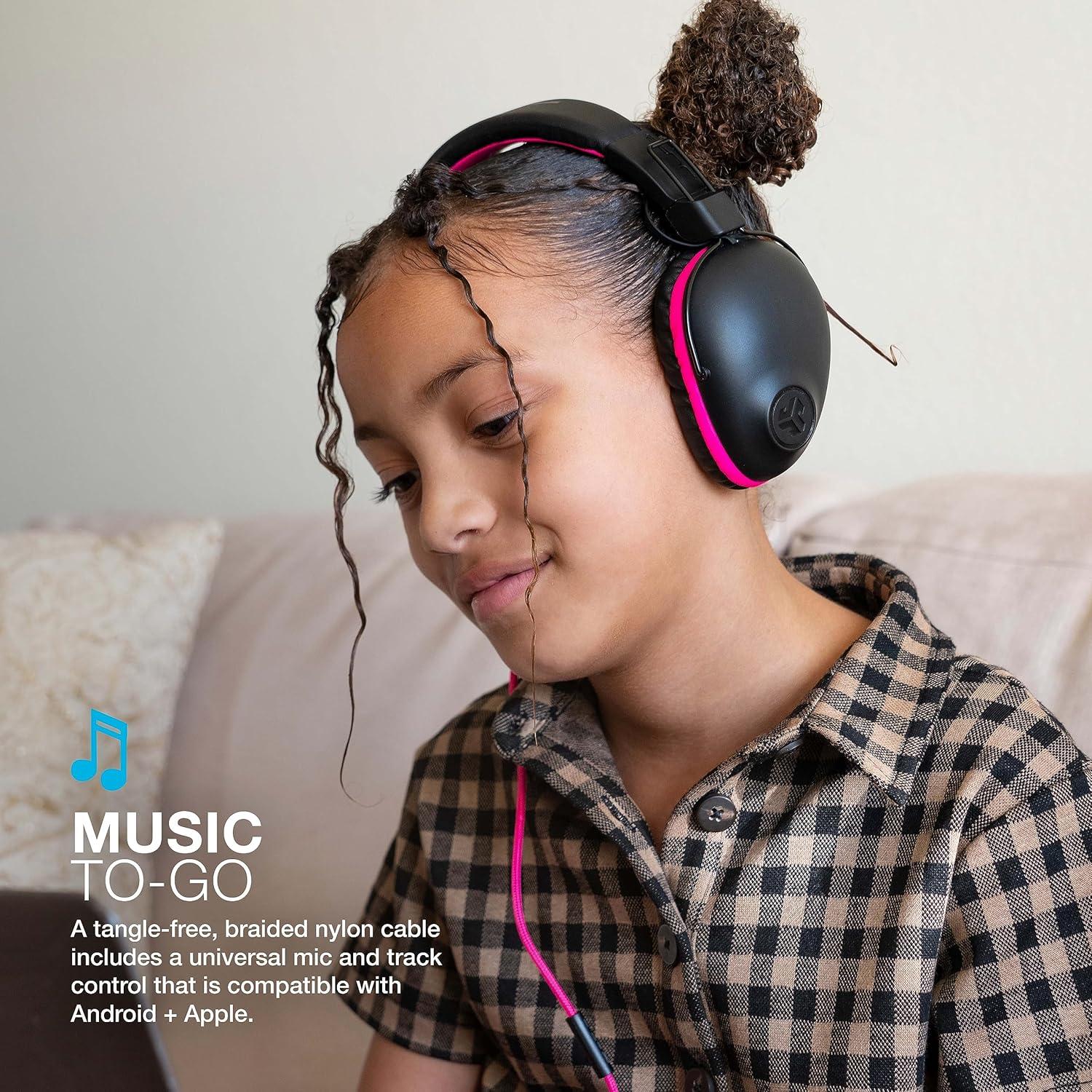 👀 INCLUDES: JBuddies Pro Wired Over-Ear Kids Headphones, Braided Nylon Cord with 90 Degree 3.5mm Jack, AUX Cord with Universal Mic + Track Controls, JLab Lifetime Warranty.